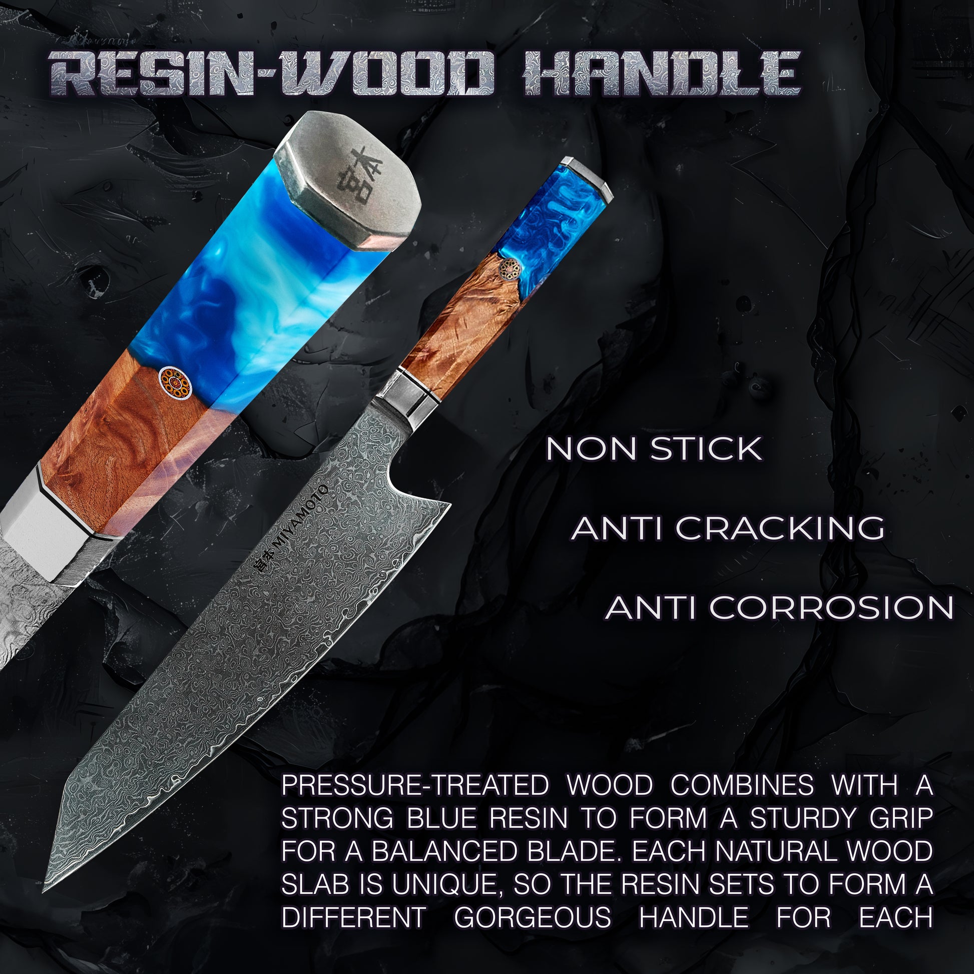 Non-Slip Handle - Crafted from stunning blue resin and selected Canadian Maple wood, this handle adds a touch of elegance to the beautiful layered damascus. Our blue resin and maple wood are incredibly durable with non-slip qualities making Miyamoto kitchen knives safe and long lasting.