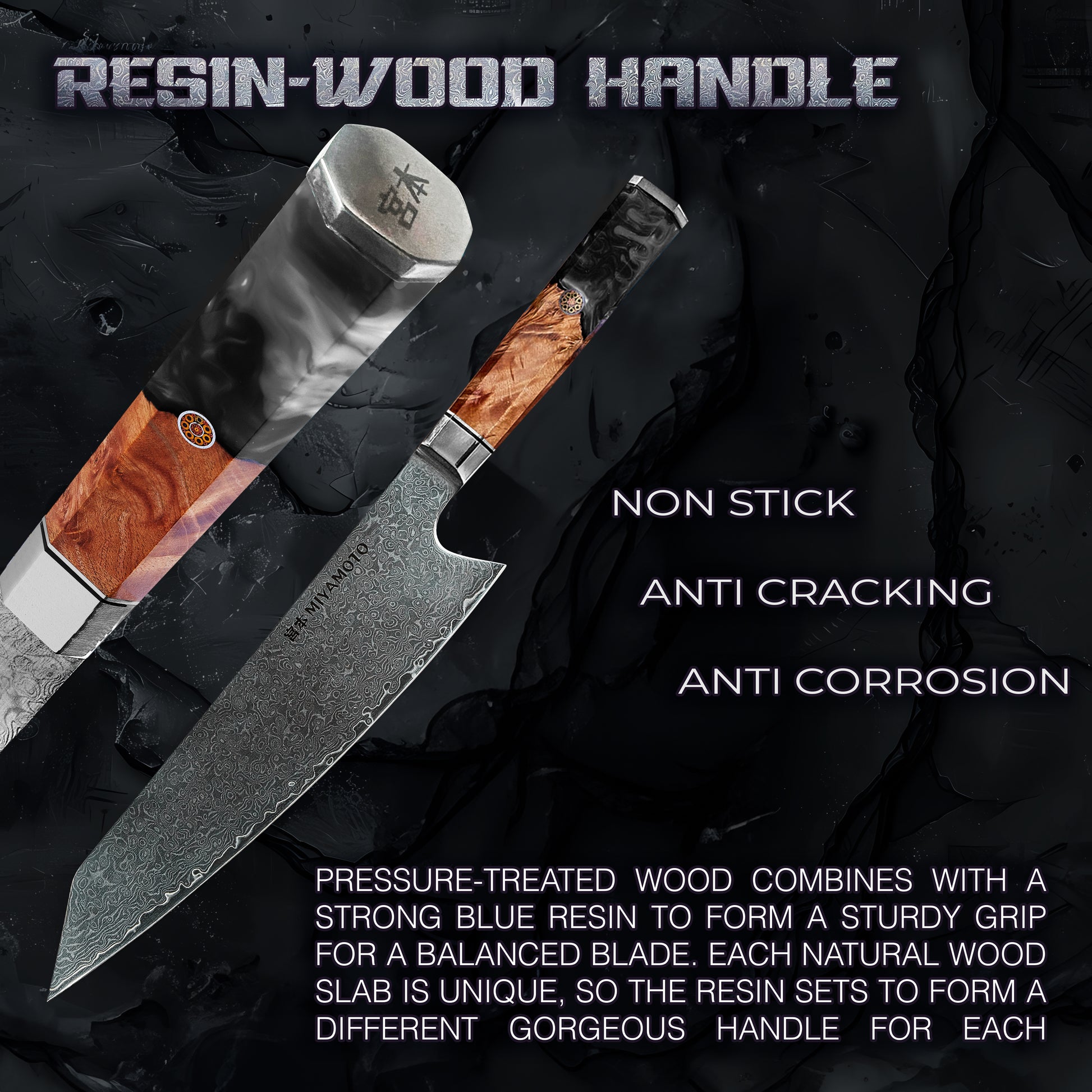 - Non-Slip Handle- Crafted from stunning black resin and selected Canadian Maple wood, this handle adds a touch of elegance to the beautiful layered damascus. Our blue resin and maple wood are incredibly durable with non-slip qualities making Miyamoto kitchen knives safe and long lasting.